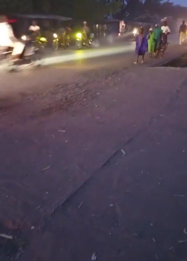 n evening street scene, likely in a town or village with rudimentary infrastructure. The road is paved but uneven, with dirt edges. Several people are walking along the road. They appear to be wearing traditional clothing. Several vehicles pass by including a van, motorcycle, car, and an auto rickshaw. The lighting is dim, relying on streetlights and vehicle headlights.