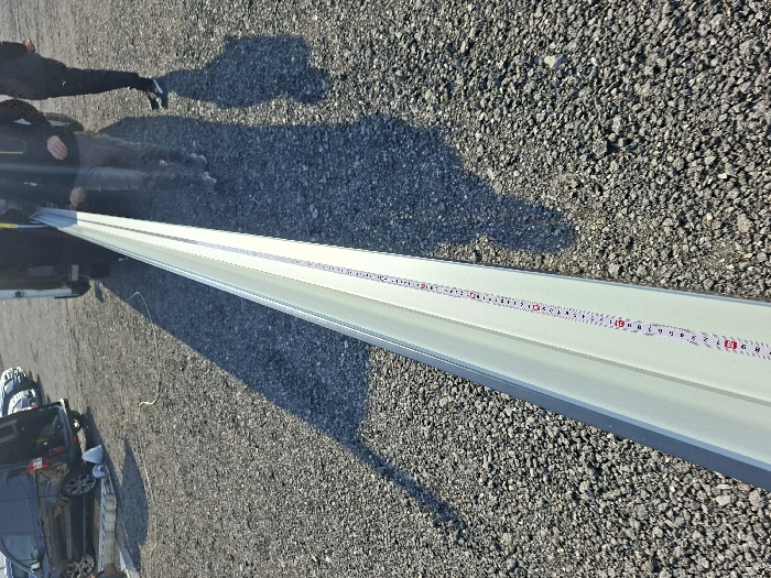 In Barakovo, Bulgaria, an outdoor scene unfolds on a gravel lot under bright daylight. A prominent, long, light-grey channel or profile, approximately 6-7 meters in length, extends from the rear of an open white utility van across the foreground. A white and red measuring tape is laid precisely along its upper surface. Three adult males are visible: one holds the channel at the rear of the white van; another, wearing a dark jacket with yellow accents and grey pants, stands beside the channel near its midpoint; and a third, in dark clothing, stands slightly behind and to the right, observing. In the background, a black commercial van with an open tailgate is parked among other vehicles. Long, distinct shadows are cast by the individuals and the channel towards the lower right, indicating direct sunlight. The activity suggests the measurement and preparation of a linear building material.