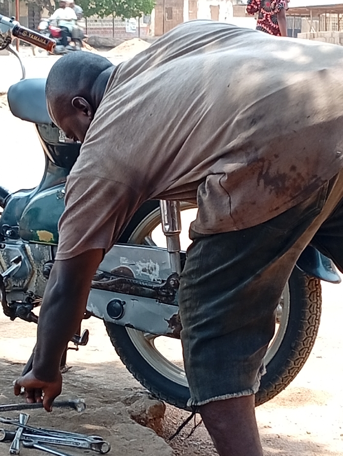 An individual is depicted mid-action, bent over a motorcycle on a dirt surface in Gboko, Nigeria