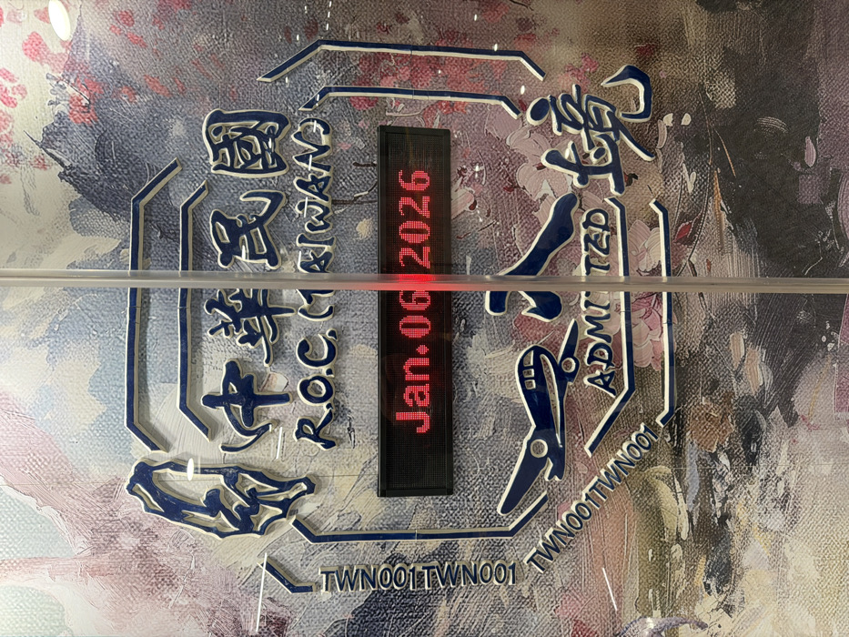This image depicts a close-up of a decorative sign or display, likely located within an immigration or arrival area in Taoyuan City, Taiwan. The central feature is a stylized graphic resembling an official entry stamp or seal, rendered in dark blue with white outlining against a textured, abstract background featuring brushstroke-like patterns in shades of blue, purple, pink, and white. Prominently displayed within this graphic are the characters "中華民國" (Republic of China) and the English text "R.O.C. (TAIWAN)". Below this, an embedded black LED screen displays "Jan. 06 2026" in red illuminated text. Further down, a stylized airplane icon is present, alongside the English word "ADMITTED" and the partial Chinese character "境", which completes "入境" (entry) when combined with the implied "入" character above. The outline of the island of Taiwan is depicted on the left side of the graphic. Repeating text "TWN001TWN001" frames the left and bottom edges of the graphic. A vertical translucent pole or support rod runs down the center of the image, partially obscuring the "Jan. 06 2026" display and some of the blue text. The surface exhibits minor reflections. No people are visible.