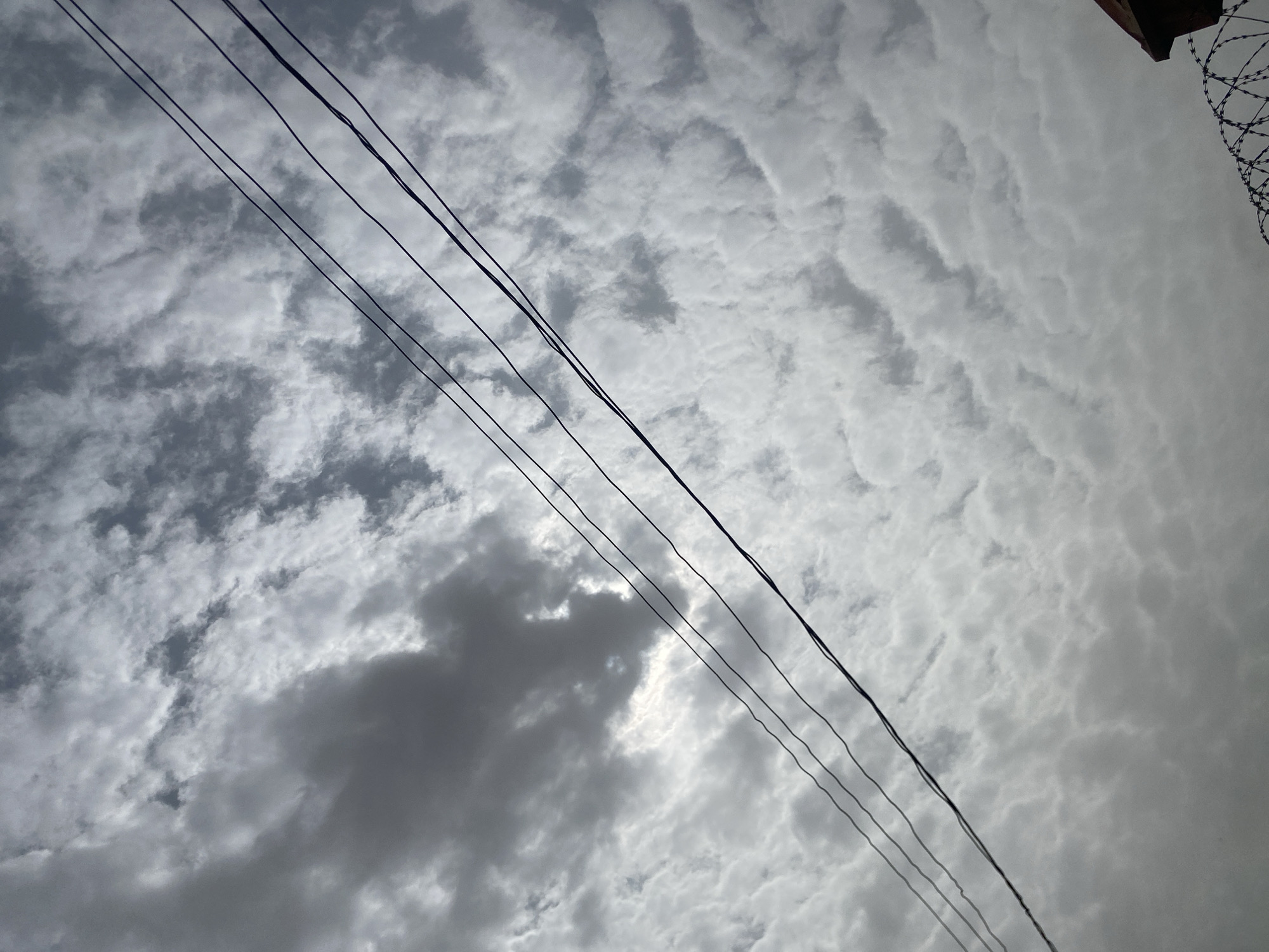 The image, taken from a low angle, shows an overcast sky in Narayi, Nigeria. The sky is filled with a mix of grey and white clouds, some forming a rippled pattern, with one prominent dark cloud blocking a patch of brighter light. Four electrical wires diagonally bisect the frame, from the upper left to the lower right corner. In the top right corner, a segment of a building with barbed wire is visible.