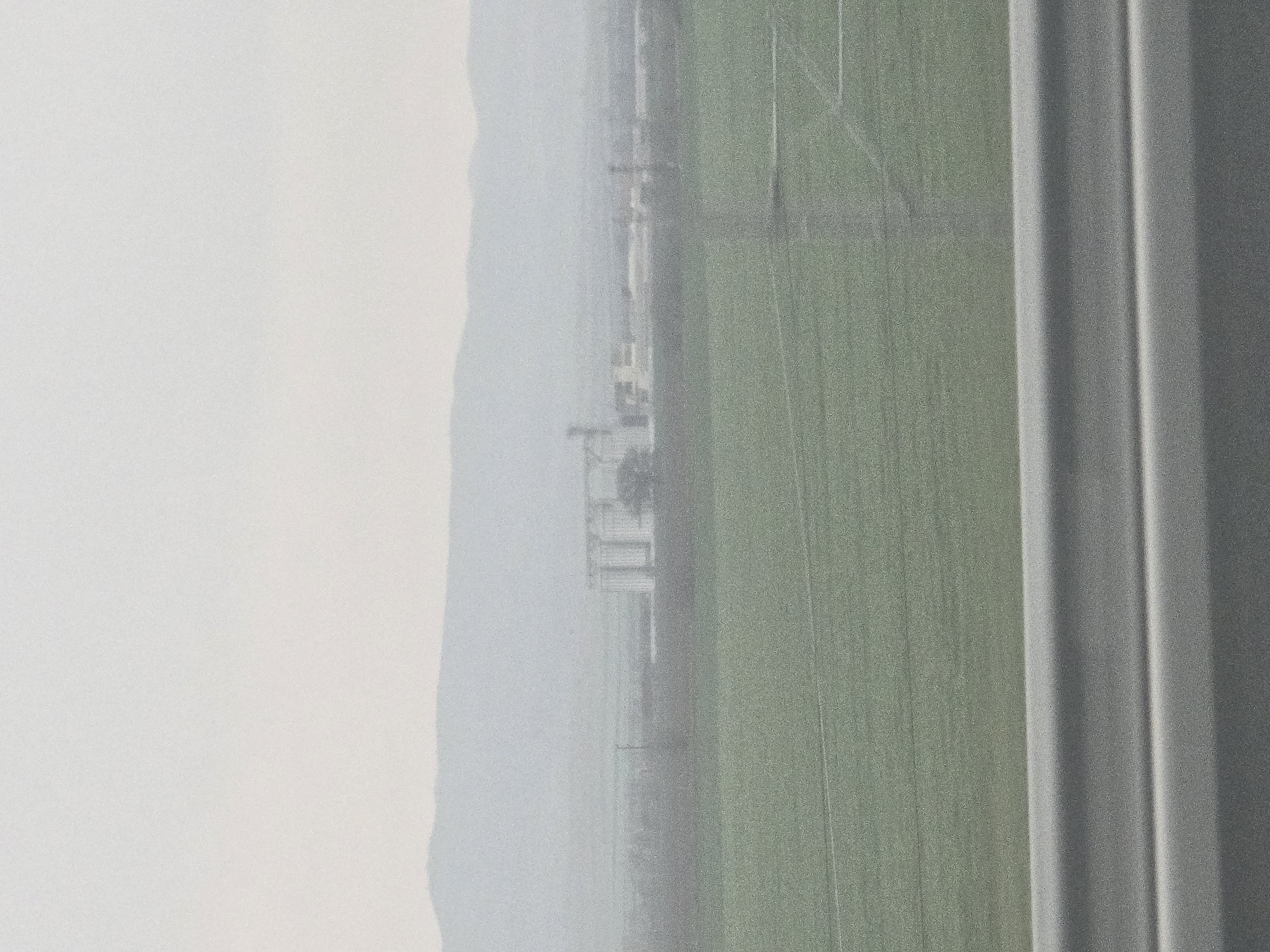 The image displays an outdoor scene in Mirovo, Bulgaria, under a uniformly light grey, overcast sky. In the immediate foreground, a two-tiered grey horizontal barrier, consistent with a guardrail, spans the bottom section of the frame. Beyond this, a wide, flat, green agricultural field occupies the midground, exhibiting faint linear patterns across its surface. In the distant background, an industrial facility is visible, characterized by multiple tall, light-colored vertical silos and a cluster of lower structures. This facility is situated against a backdrop of hazy, indistinct mountains or hills. No individuals, specific actions, or interactions are discernible within the frame.