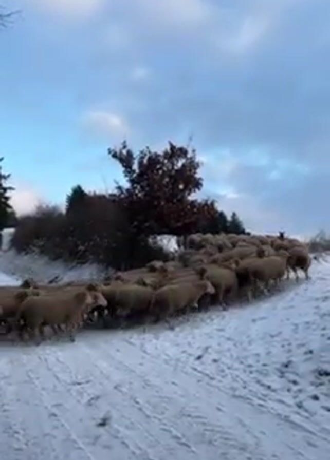 large flock of sheep walking on a snowy path. The sheep are light brown in color and are densely packed together. The path is covered in snow, and there are trees and bushes on either side. The sky is blue with some clouds. There are also electrical wires in the shot.
