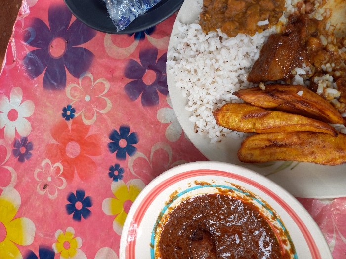 An overhead view depicts a meal served on a table covered with a pink plastic tablecloth featuring a repetitive floral pattern in shades of white, light pink, yellow, blue, and purple. The scene includes two main plates of food and a partially visible third. To the left, a white bowl with a red and blue striped rim contains a rich, dark reddish-brown stew, likely meat-based, with visible oil sheen and solid chunks within the sauce. To the right, a white, slightly oval plate holds a serving of white rice, intermingled with occasional reddish-brown flecks. Alongside the rice are three elongated pieces of golden-brown fried plantain. A separate portion of the plate features a reddish-brown stew containing visible legumes, likely beans, and a piece of meat submerged in the sauce. In the upper right corner, a portion of a small, dark blue or black plate is visible, holding a clear plastic sachet, possibly containing water or a beverage. No individuals are present. The image itself does not provide sufficient visual information to determine a specific location within the city of Oturkpo, Nigeria.