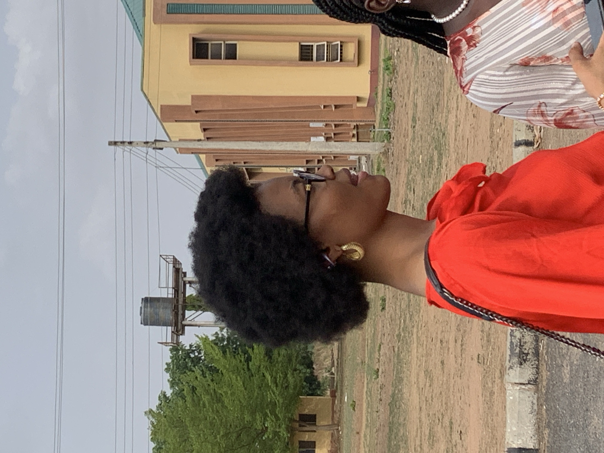 The image depicts two individuals in an unconfirmed outdoor location in Unknown, Nigeria. The primary subject, a young Black female, is captured from the chest up in profile, facing right. She possesses voluminous, dark Afro-textured hair, wears gold-colored textured hoop earrings, and thin-framed eyeglasses with dark lenses. A small purple earbud is visible in her left ear. She is dressed in a bright red garment, potentially a top or dress, with visible ruffles or gathered fabric near the neckline, and a dark strap with metal chain accents crosses her left shoulder. She has a slight smile and her mouth is partially open. To the right, a second young Black female is partially visible from the torso up. She wears a pearl necklace and a light-colored patterned garment featuring vertical stripes and reddish-brown floral motifs. Her right hand, adorned with a ring, holds a dark object, likely a mobile phone. Her hair is dark and braided. The background features architectural structures and natural elements under an overcast sky. A prominent multi-story building with a light yellow/beige facade, brown vertical architectural elements, and a green/teal roof is situated behind the individuals. Multiple rectangular windows, some with louvers, are visible on this building. A concrete utility pole with multiple horizontal power lines stands in the mid-ground. Further left, a smaller, single-story light yellow building is visible behind green trees. A dark water tank on a raised platform, possibly wooden or metal, is visible in the far background above the trees. The ground in the mid-ground is largely bare, dry, light brown earth with sparse patches of green vegetation. A concrete curb separates a dark, paved surface in the immediate foreground from the dirt area.