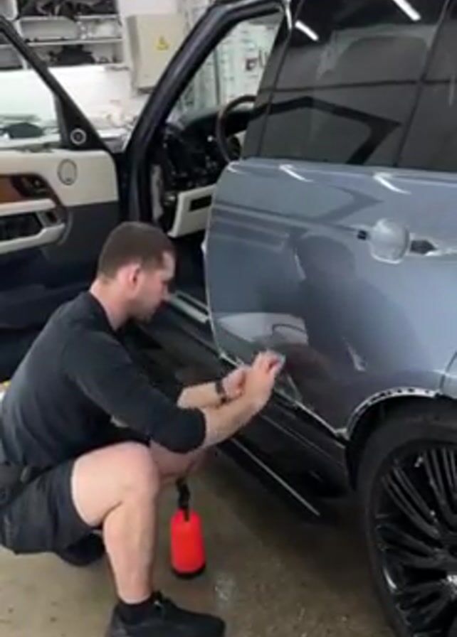 - "man applying film to a light blue Range Rover SUV in a garage" by FM-SD1Rj2, licensed under CC BY 4.0