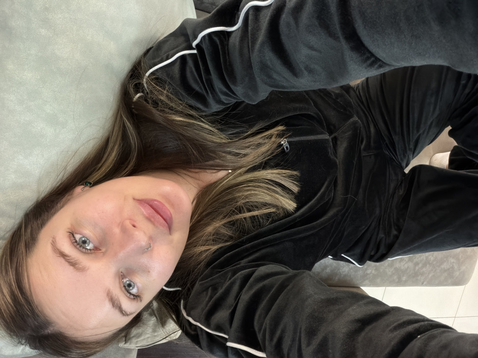 A female individual is depicted in an indoor setting within Chaikovsky, Russia. The subject, seen from a high-angle perspective, faces directly towards the camera, indicative of a selfie. She has light skin, blue eyes, and light brown hair with blonde highlights extending over her shoulders. A small silver-colored nose ring is visible in her left nostril, and a dark green stud earring is present in her right earlobe. Her lips are full, and she exhibits a slight, closed-mouth smile. She wears a black velour tracksuit, consisting of a full-zip hoodie jacket with white piping along the shoulders and sleeves, and matching pants. A thin, silver-colored necklace with a small, reflective pendant is visible around her neck. The individual is seated or reclining on a light grey or off-white cushioned surface. A white or very light-colored floor is visible in the lower left foreground.