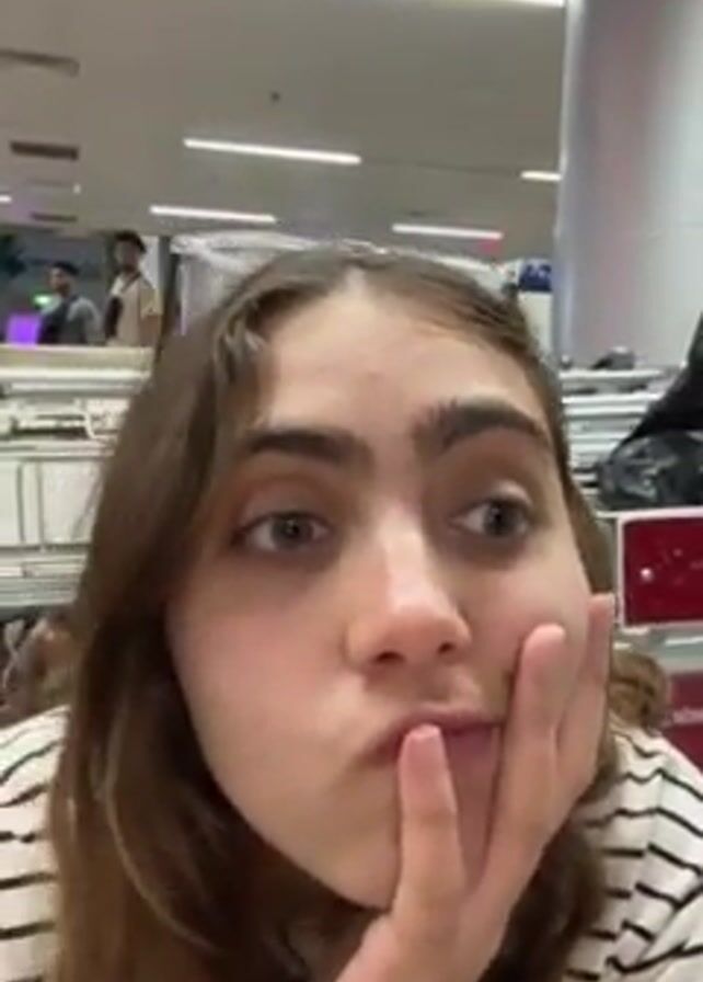 A woman rests her face on her left hand while looking directly into the camera. Her glasses rest on top of her head. She has light brown, wavy hair and wears a black and white striped shirt. The background shows an indoor space with an off-white ceiling, visible air conditioning vents, and other people and items.