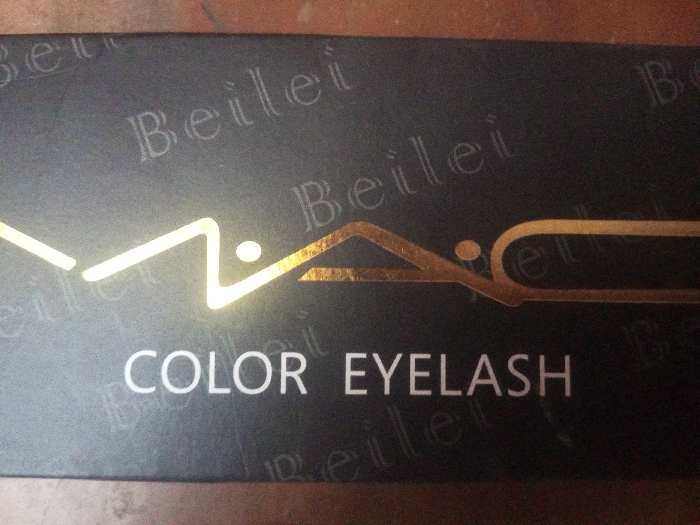 The image displays a close-up, overhead view of a dark-grey or black rectangular product package. A stylized "MAC" logo, rendered in metallic gold with a reflective surface, is prominently featured in the upper-middle section. Below the logo, the words "COLOR EYELASH" are printed in white capital letters. The background of the package is subtly textured with a repeating, low-contrast pattern of the word "Beilei" in a slightly lighter dark tone. Minor surface dust and slight scuff marks are visible on the packaging. The image provides no contextual information to determine its geographical location, including any association with Zee Pin Kone, Myanmar.