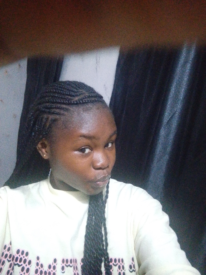 An image depicts a young female individual positioned for a photograph in what appears to be an indoor setting in Keffi, Nigeria