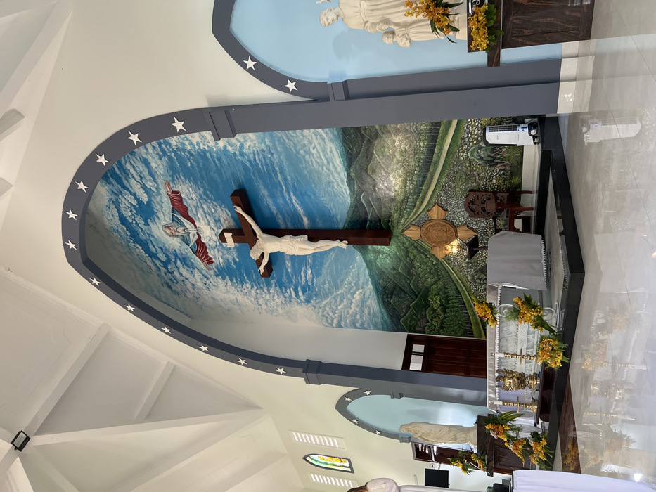 The interior of a church features religious artwork on the ceiling. A depiction of Jesus Christ on the cross is centered above, with a figure in flowing robes to the left. The background is a blue and white sky scene. A detailed, textured mural of a landscape is below, with a decorative cross on the wall. The space is illuminated by bright light, reflecting off the polished floor. Yellow floral arrangements are visible near the altar.