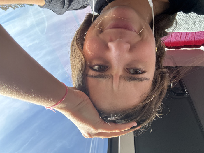 A medium close-up, slightly low-angle photograph depicts a young female subject inside what appears to be a vehicle