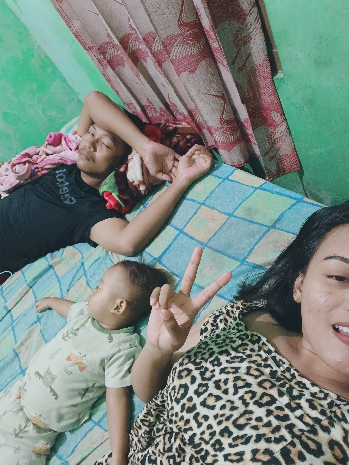This image captures three individuals inside a room, likely a residence, in Kecamatan Pati, Indonesia. A male adult is lying on his back on a bed, eyes closed, wearing a black t-shirt. His left arm is bent, with his hand resting under his head on a rolled-up, patterned blanket. To his right, an infant, wearing light green pajamas with animal patterns, is lying on its left side, facing away from the camera. In the lower right corner, a female adult, partially visible, is taking a selfie; she wears a leopard print top, her face shows a slight smile, and her right hand displays a two-finger 'peace' sign. The bed is covered with a light blue and white checkered sheet, and a red and white patterned curtain hangs against a light green wall in the background.