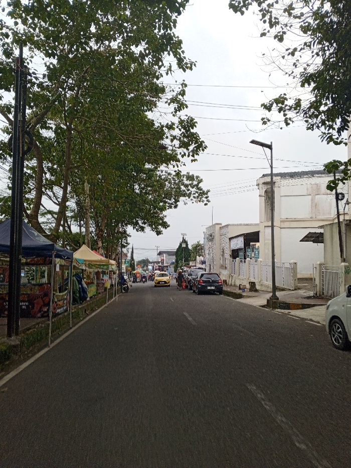 This image depicts a wide-angle view of a street in Kheda, India, under an overcast sky. The asphalt road occupies the central and lower portions of the frame. On the left side, a series of utility poles run parallel to the road, with multiple power lines suspended above. A dense line of mature trees with green foliage lines the left edge of the road, behind which a row of market stalls with various colored awnings, including dark blue and beige, are set up. Banners, one with red text on a dark background, are displayed on the front of these stalls. On the right side of the road, a white building with a distinctive architectural facade extends into the distance, fronted by a low white fence or railing. A modern street lamp with a flat, rectangular light fixture stands on the sidewalk in front of this building. Several vehicles are present on the road: a black sedan is parked along the curb on the right, with a small group of people standing near it. Further down the road, a yellow sedan is in motion, followed by other distant vehicles and pedestrians, indicating active traffic. The partial front right wheel well of a white car is visible in the extreme lower right foreground.