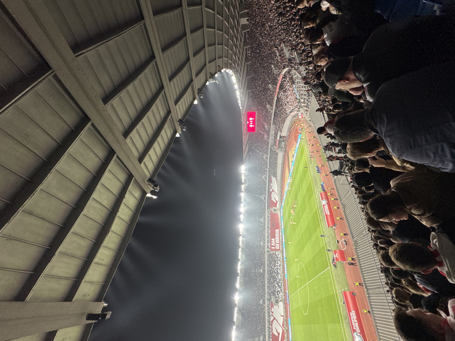 A stadium, seen from an elevated angle, is filled with spectators. A soccer field, illuminated with bright lighting, features players in yellow and green jerseys. Red advertisements line the perimeter. Stadium roofing is visible to the left, contrasted against the dark sky. The stands are densely packed, and a scoreboard displays a red light in the distance.