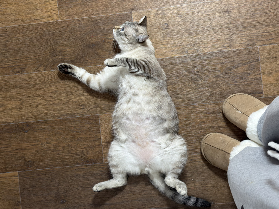 - "A domestic cat with light grey and subtle tabby markings is depicted lying on its back on a medium-brown wooden floor, exposing its light pink abdomen" by FM-pEr6u2, licensed under CC BY 4.0