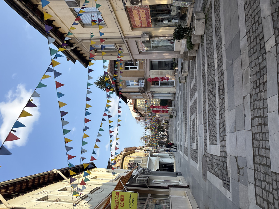 An outdoor wide-angle shot depicts a pedestrian street in Vratsa, Bulgaria, under a clear blue sky with scattered white clouds