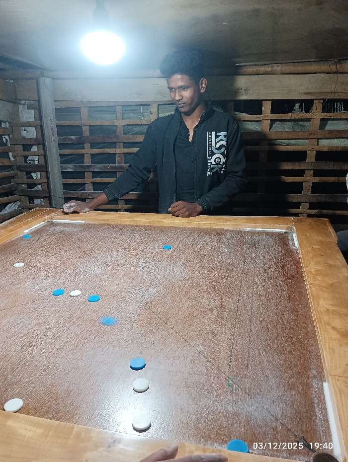 This image, captured at 19:40 on March 12, 2025, in Maliat, Bangladesh, depicts an indoor scene featuring a carrom game