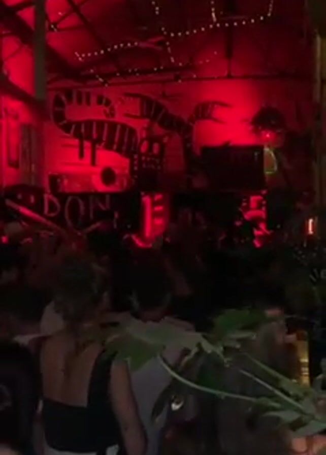 crowd of people dancing at an indoor party with a red light and graffiti on the walls. The camera is positioned from the back of the crowd. The lighting is dark and red. People are dancing to music. There are plants visible near the camera. The crowd is dense, and people are moving around.