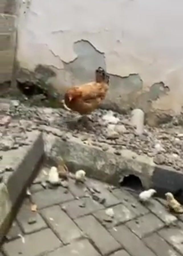 A hen and her chicks are standing on a brick-paved area next to a curb. The curb is lined with small rocks and debris. A white wall, partly covered with peeling paint, stands in the background. The hen is reddish-brown and the chicks are mostly white, though a few are darker. Someone approaches with a broom, seemingly to sweep.