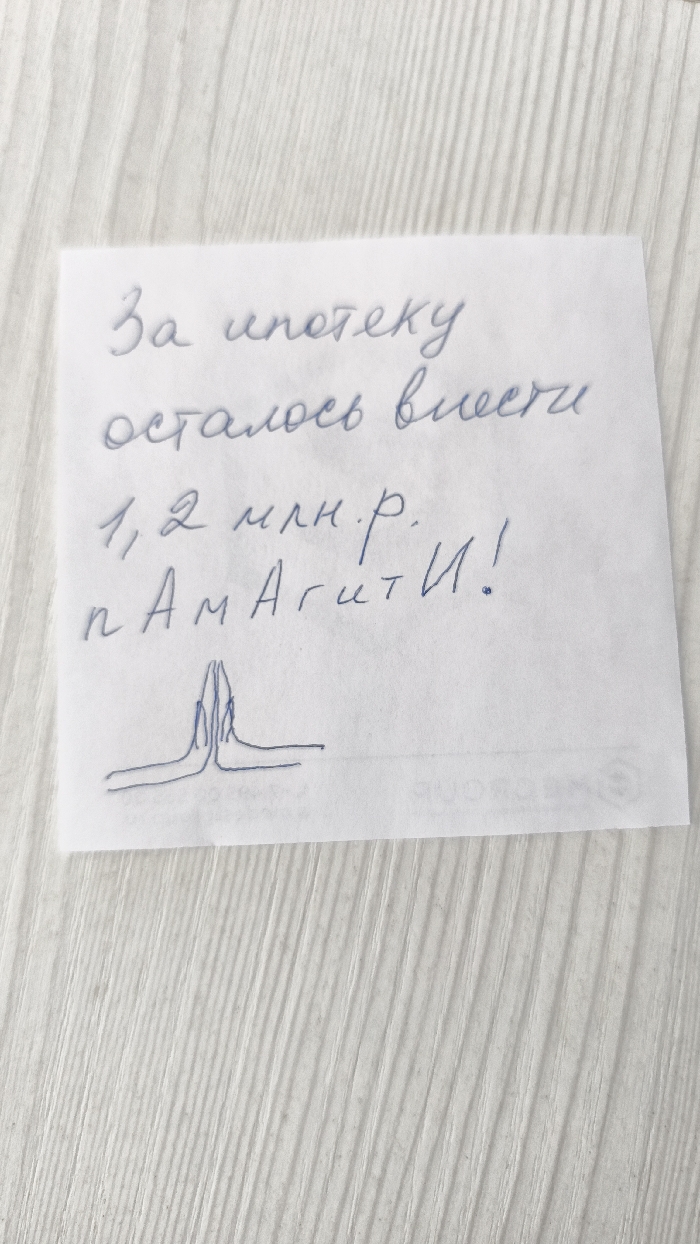 A white rectangular paper note, possibly a sticky note, is centrally placed on a light-colored wooden surface featuring distinct vertical grain patterns. The note contains handwritten text in blue ink. The text, in Russian, reads: "За ипотеку осталось внести 1,2 млн.р. пАмАгити!" This translates to: "For the mortgage, 1.2 million rubles remain to be paid. Help!" The word "Help!" is visually emphasized with capitalized 'A's, conveying urgency or distress. Below the text, a simple line drawing in blue ink depicts two hands clasped together in a gesture commonly associated with prayer or pleading. The scene presents a static, close-up view of an indoor environment, such as a desk or table, consistent with a personal message left within a residence or office located in the city of Chaikovsky, Russia. No individuals, specific actions, or other discernible objects are visible in the image beyond the note and its immediate surface.