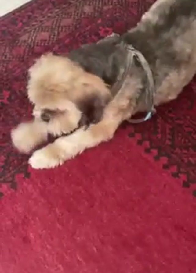 small dog on a red patterned rug, arching its back and stretching its front legs forward in a yoga-like "downward-facing dog" position, then shaking its head and body. It has a light brown head with darker brown and grey fur on its back and a light blue harness. The rug has an intricate dark pattern on a field of red. The rug lies on a light-colored floor.