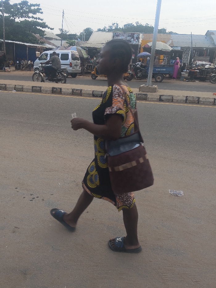 The image captures an outdoor street scene in Zango-ndaji, Nigeria, under a hazy sky. In the foreground, a dark-skinned adult female walks from right to left across a dusty ground surface. She wears a knee-length dress featuring a black background with colorful, patterned fabric, and dark blue slip-on sandals with a white "LV" logo visible on her right foot. She carries a small, clear cylindrical object in her right hand and a dark brown shoulder bag with a lighter brown horizontal stripe hangs from her left shoulder. Behind the woman, a paved road with a concrete curb separates the foreground from the background activity. A silver van is parked or moving slowly on the road, and a man on a motorcycle, wearing a patterned shirt, rides from left to right, partially obscured by the van. Further right, a yellow tricycle and a blue cart labeled "GAYONG" under a white umbrella are visible alongside the road. The background is lined with single-story market stalls or shops, many with corrugated metal roofs. A sign for "Kaftan Ready Made & Fashion Cafe" is partially visible. Several other individuals are present in the background, some seated, some standing near the stalls and vehicles, including a woman in a pink headscarf and dress. Trees are visible above the structures in the far background.