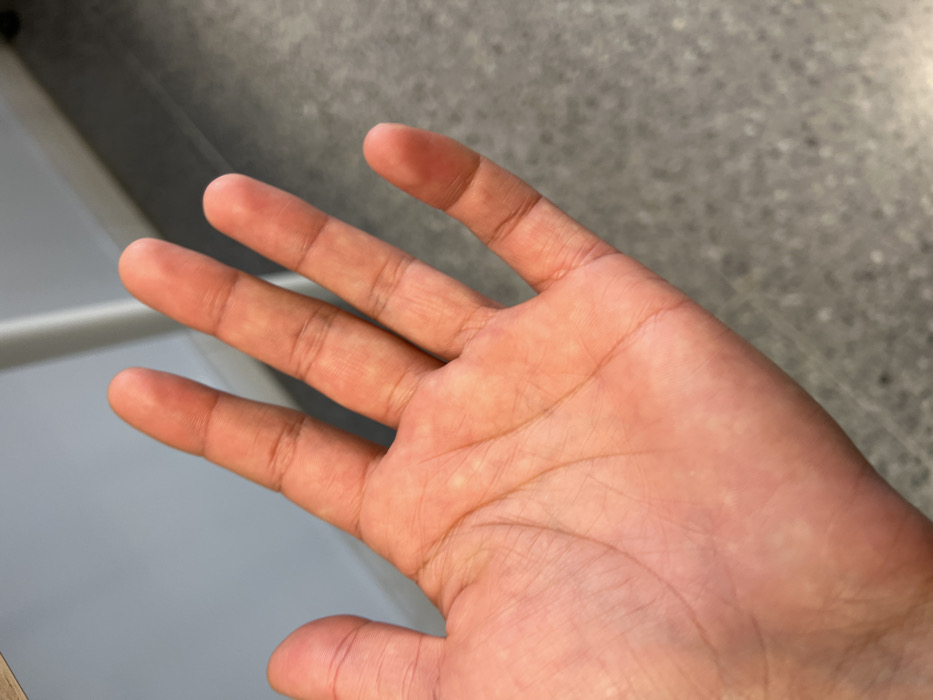 close-up of a person's right hand, palm facing the camera, with all five fingers extended. The hand is resting on a grey tile floor. There is a white wall and a partially visible white tabletop in the background. The person's hand has visible white spots across the palm and fingers, with a reddish hue to the skin. The image appears to have been taken inside a building, possibly a bathroom, based on the surrounding environment. The coordinates provided place the location in Málaga, Spain, specifically within the city center. The image was taken from a slightly elevated angle and shows no other individuals present in the scene.