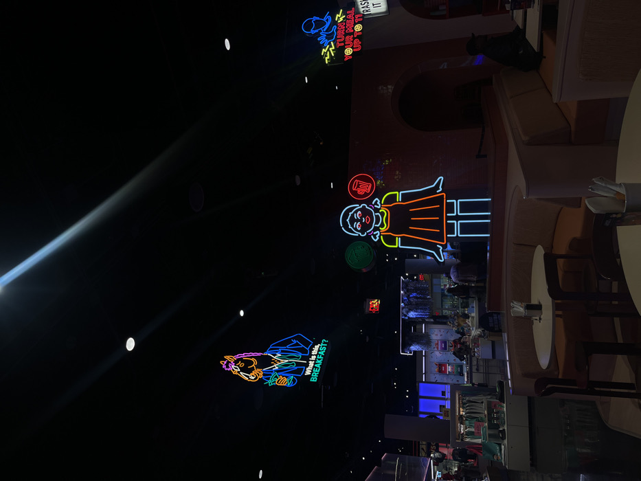 This image depicts the interior of a large, dimly lit commercial establishment, identified as Legacy Hall in Plano, Texas, a suburb within the Dallas-Fort Worth metropolitan area. The environment features a high, dark ceiling dotted with recessed spotlights and adorned with prominent neon art. In the upper left, a neon sign illuminates a stylized purple and blue horse-like figure, resembling BoJack Horseman, holding a green beverage, with the text "What is this, BREAKFAST?" in green neon below. Dominating the center-right is a large neon figure of the "Red Light, Green Light" doll from Squid Game, rendered in orange and blue. Above this doll are two smaller circular neon signs, one green and one orange with a cup icon. To the upper right, a blue neon sign shows a figure emitting lightning bolts, accompanied by the text "TURN YOUR MEAL UP TO 11," with a partially visible white sign reading "RASH IT" nearby. The midground showcases a dining area with multiple light-colored circular tables and booth seating featuring light brown/orange cushions and lighter pink/beige backs. Some tables have black condiment caddies. In the background to the left, a retail section is visible with clothing racks, illuminated display cases, and shelves of merchandise. To the right, architectural elements include reddish-brown arched structures. Several indistinct individuals are present in the background; one person in a dark cap is seated at a table on the far right, while others are seen standing or moving within the retail area.