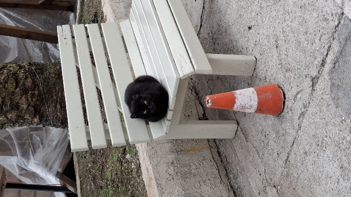 - "The scene, located in Podbadac, Montenegro, depicts an outdoor area with a black feline resting on a white slatted wooden bench" by FM-5Zve72, licensed under CC BY 4.0