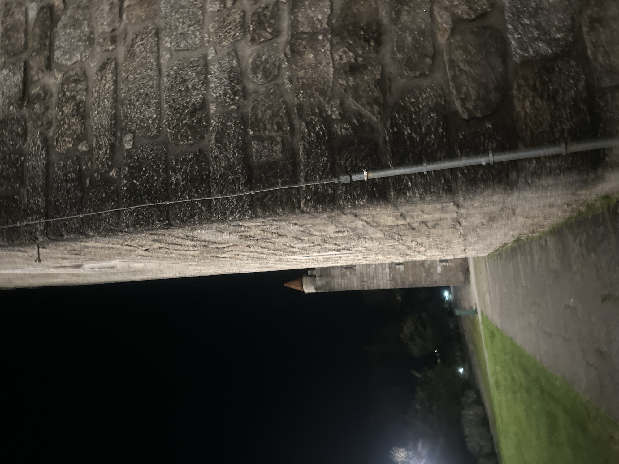A nighttime scene depicts a section of the Castelo de Guimarães in Guimarães, Portugal. A large, rough-hewn stone wall, constructed from dark grey, irregular blocks with visible mortar, occupies the right side of the vertical frame, extending from top to bottom. A vertical, light grey metal conduit is affixed to this wall, secured by two visible clamps. To the left of the wall, a narrow, light-colored paved pathway curves gently towards the background. Adjacent to the pathway on its left is a strip of manicured green grass. The background features a dark, tree-lined area under a black, starless sky, with several diffused, distant artificial light sources appearing as white or blue-green glows. In the mid-background, a distinct stone tower, similar in construction to the foreground wall, is visible, topped with a prominent, conical reddish-orange roof. No people or active subjects are present. The scene is illuminated by unseen artificial light sources.