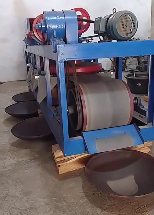 stationary machine, primarily blue in color, with a large gray roller that spins. The machine is sitting on a wooden pallet on a concrete floor. A motor is visible on top of the machine. Several dark, round pans are placed around the base of the machine. The background shows a white wall and additional equipment.