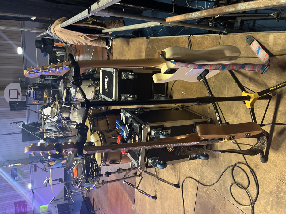 Two electric guitars stand on Hercules guitar stands. One is white with a colorful strap, the other a natural wood finish with a decorative strap. They're positioned in front of a drum set and some equipment cases. The setup appears to be on a stage, likely for a live music performance. Overhead rigging is visible at the top. A basketball hoop can be seen in the background.