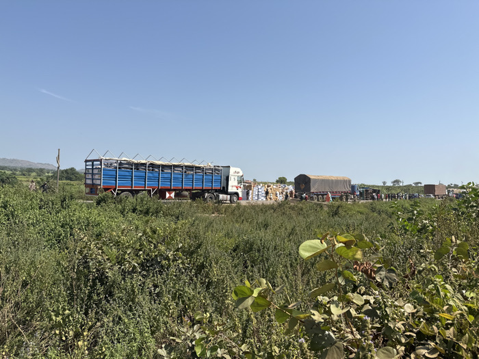 This image depicts an outdoor scene in Bishini, Nigeria, under a clear, bright blue sky. The foreground is filled with dense, green, leafy vegetation. In the mid-ground, a line of large vehicles is halted on a dirt road or track. A prominent white semi-truck with a blue, open-sided caged trailer, partially covered by a white tarp, is positioned on the left, with visible blue objects inside its trailer. To its right, another large truck with a brown canvas cover is stopped. Adjacent to this brown truck are multiple tall stacks of white or light-colored sacks, indicating a substantial quantity of goods. Numerous individuals, estimated to be several dozen, are congregated around these trucks and the stacked commodities, primarily standing and observing or interacting with the goods. On the far left, a person on a motorcycle is faintly visible near the blue truck. The background shows a distant, hazy green landscape with low hills or mountains on the left horizon, under a clear sky. The scene suggests a distribution or transit point for goods with a crowd gathered around the parked trucks.