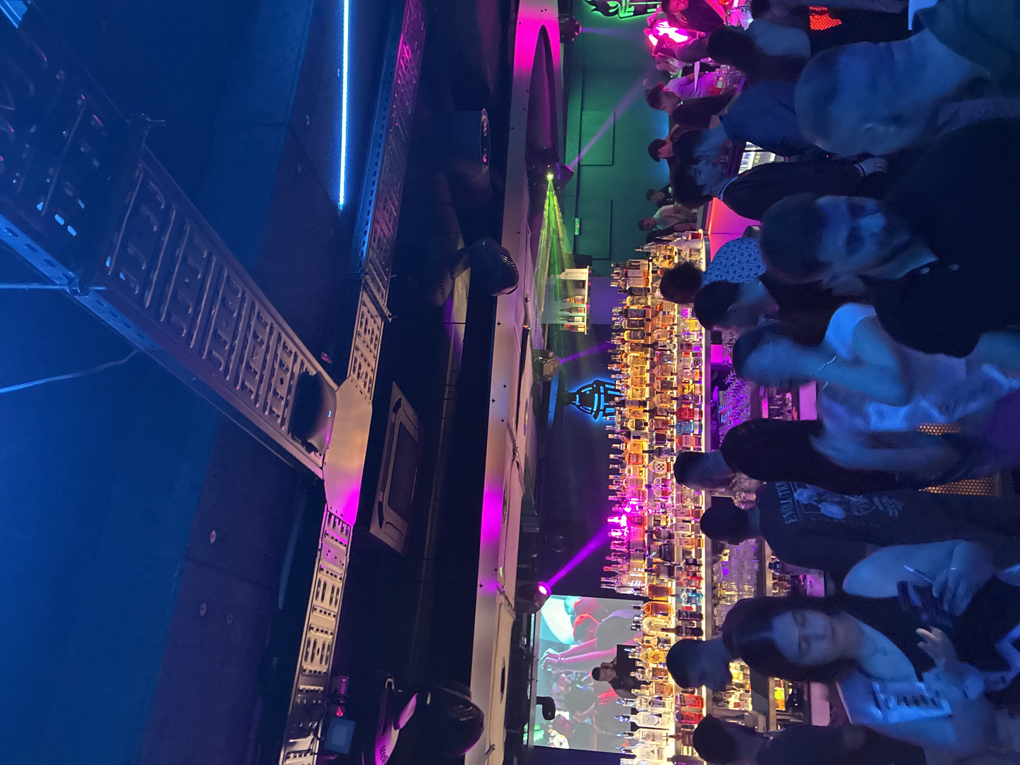 The image depicts a busy bar scene in Sofia, Bulgaria. Numerous people are standing and sitting at the bar, interacting with bartenders and each other. Behind the bar, a wide selection of bottles is arranged, illuminated by vibrant pink and purple lighting. A screen displays a video or image. The ceiling features industrial-style structural elements with neon lighting. The overall atmosphere is lively and energetic.