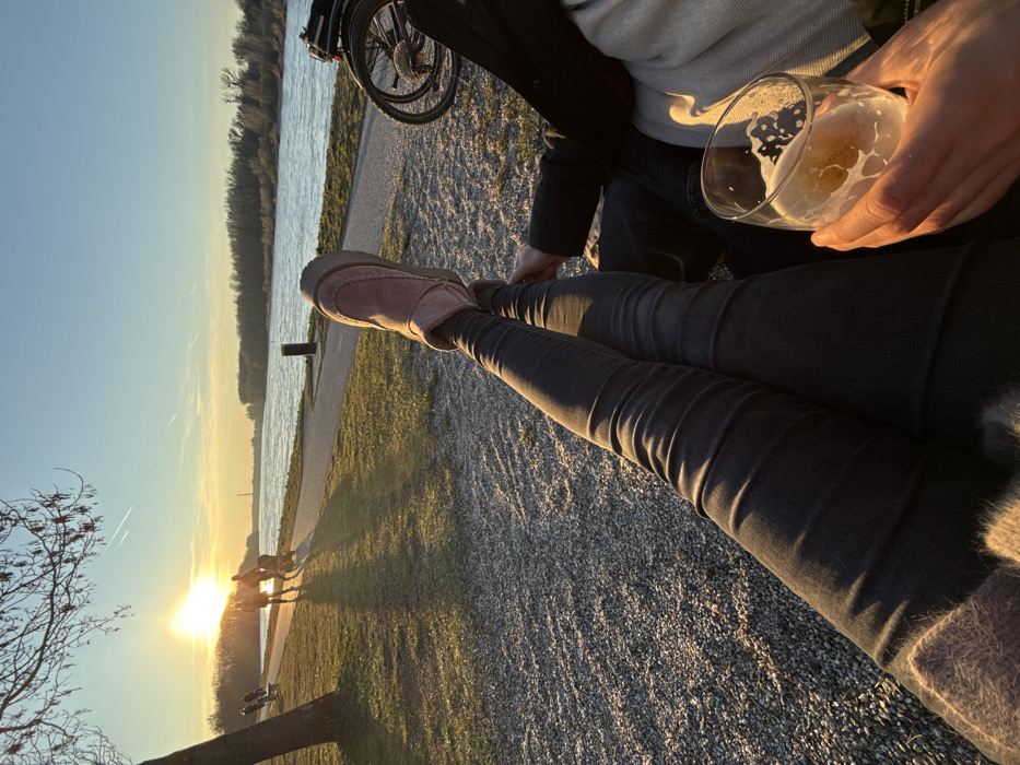 The image depicts a riverside scene at sunset in Hainburg an der Donau, Austria. In the immediate foreground, a person's legs, clad in dark jeans and light brown Ugg-style boots, are crossed with one foot elevated. A hand, holding a glass containing beer with foam, is visible. Adjacent to this individual, part of a second person, wearing dark clothing, is present. Both are situated on a gravel surface. To the right, the rear wheel and frame of a black bicycle are partially visible. The midground features a paved pathway running parallel to the Danube River, separated by a grassy area. The setting sun, low on the horizon to the left, casts long shadows across the grass. Silhouettes of several individuals are visible on the paved path, including two adults pushing a stroller. The river flows from left to right across the frame, with trees lining both banks. The sky is clear with faint contrails. A distant structure is discernible on the far left horizon.