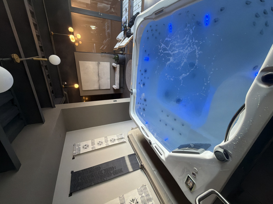 An upward-angled shot shows a modern indoor space featuring a large, white hot tub filled with vibrant blue water