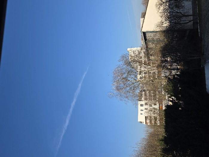 The scene depicts an exterior view of an urban area in Unknown, Unknown, under a clear, bright blue sky. A distinct white aircraft contrail stretches diagonally from the lower-left to the upper-right of the sky, with a fainter contrail visible in the upper-right quadrant. The mid-ground is dominated by a modern, multi-story residential building, predominantly white with dark sections, featuring multiple windows and balconies. To the right of this building, a lower, light-colored structure with vertical window or slat features is partially visible. The foreground and mid-ground contain numerous trees, predominantly bare deciduous species, along with dark evergreen bushes at the bottom edge. No individuals or active interactions are present. The top of the image is partially cropped by a dark horizontal element, consistent with a window frame.