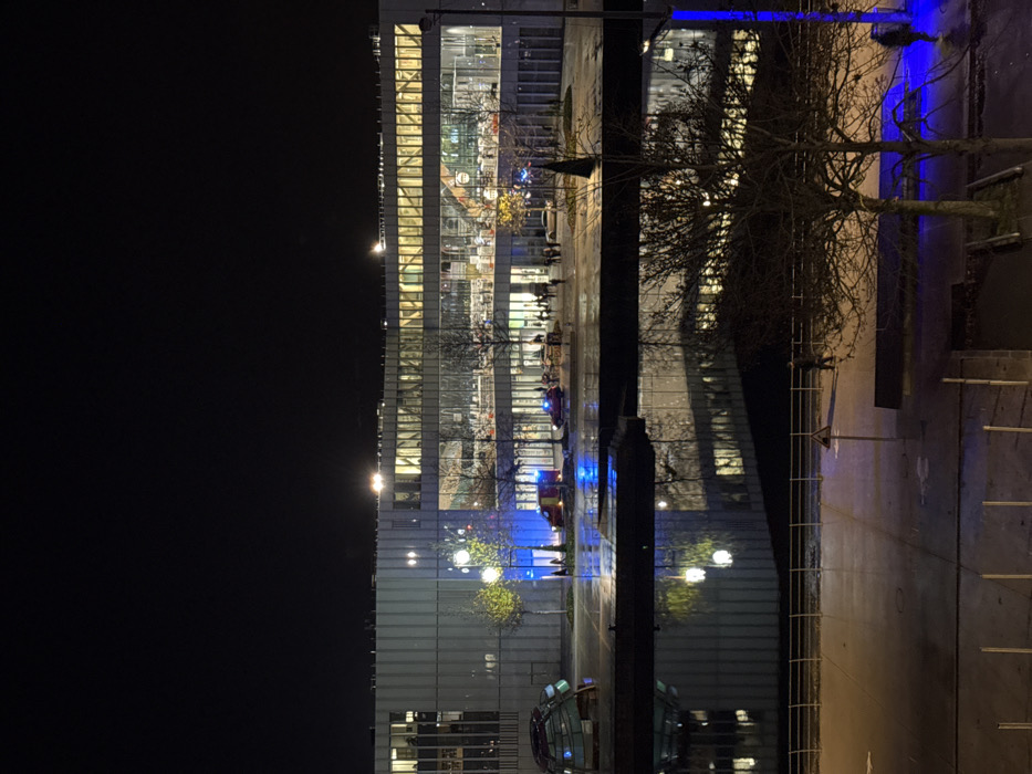 At night, a tall, modern building with illuminated windows reflects on a wet surface. Bare trees and a streetlight pole stand beside a paved area with parking lines. Blue lighting accents a tree. The left side of the image is dominated by darkness. The building’s lights suggest activity inside, while the outside area seems empty and reflective.