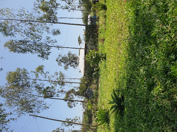 The scene depicts an outdoor environment in Kobura ward, Kenya, under a clear, light blue sky. The foreground is dominated by unevenly cut, lush green grass. Two large, agave-like succulent plants, dark green in color, are prominently positioned in the mid-left, casting distinct shadows to their right. Further back, a dense line of tall, slender trees with light green foliage, consistent with Eucalyptus species, rise vertically, partially obscuring the background. A single-story building with a light-colored, possibly corrugated metal, sloped roof is visible through and above the trees in the background. A dark, linear feature, potentially a fence or dense low vegetation, separates the grassy foreground from the area immediately surrounding the building. On the far left, a thin wooden utility pole is present, with faint overhead lines extending across the sky. No human figures or animals are visible. The scene is illuminated by natural sunlight.