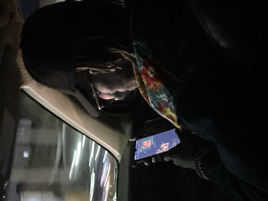 - "A person with dreadlocks and glasses sits in a vehicle at night, illuminated by the glow of a smartphone they are holding" by FM-tE3Cp2, licensed under CC BY 4.0