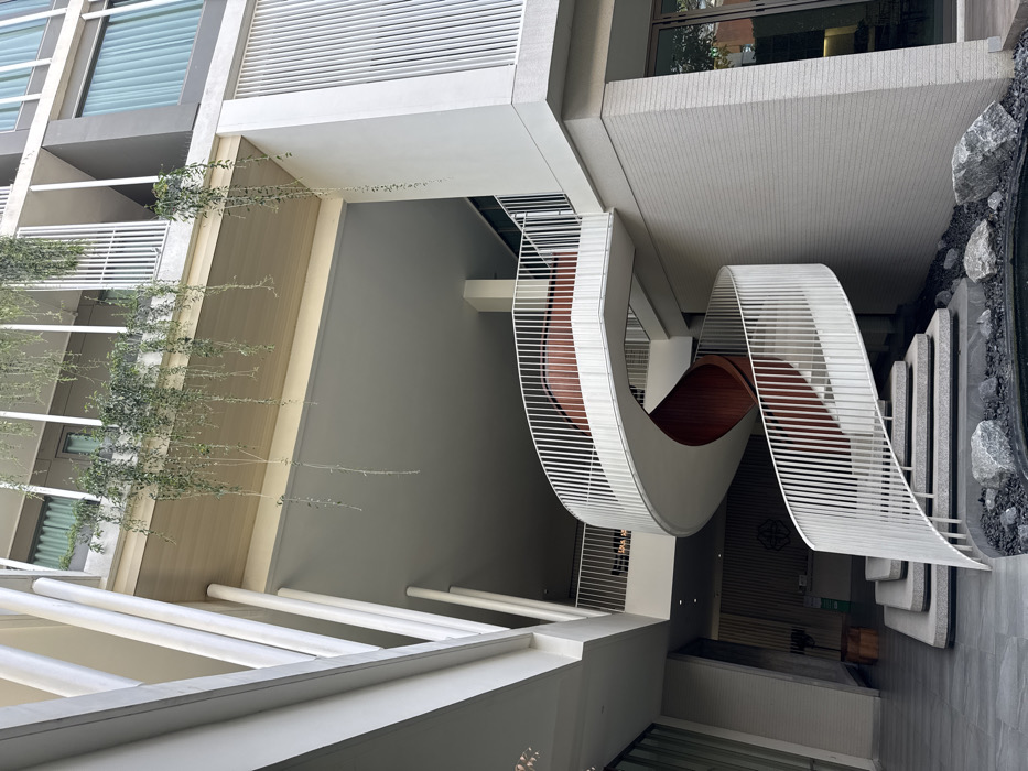 This image captures a multi-level architectural structure in Nong Pa Khrang, Thailand, characterized by a prominent spiral staircase and extensive plant life. The central feature is a white-railed spiral staircase, internally lined with dark wood, ascending from a series of curved, light gray concrete steps on the ground floor. The ground surface is paved with dark gray tiles, and a small decorative pond or water feature, filled with dark stones and several large gray rocks, is situated at the base of the staircase. The building exhibits a modern aesthetic with light gray and white facades, incorporating both smooth rendered surfaces and textured brickwork. Multiple upper levels are visible, featuring balconies or open walkways from which numerous long, green vines cascade downwards. Large windows with dark frames are present on the upper exterior walls, revealing interior spaces. Vertical white columns provide structural support. The overall environment appears to be a semi-enclosed atrium or an open-air lobby space. No individuals are depicted within the scene, and consequently, no actions or interactions are observed.
