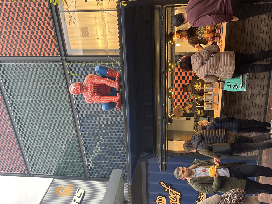The image presents an outdoor commercial area in Reichstett, France, centered on a food stall with a prominent Spiderman statue overhead
