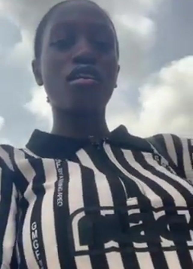 A young African woman stands outside, wearing a black and white striped shirt with a zipper. The camera is held at a low angle, looking up at her face and the sky. The background includes a building and cloudy sky. The woman is looking at the camera and appears to be talking. She appears to be moving slowly.