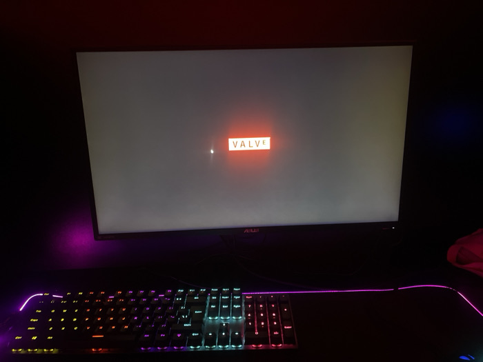 The image displays an indoor scene, likely a dimly lit room, focusing on a computer setup. A flat-panel monitor, identified by a faint "ASUS" logo at its bottom center bezel, is prominently featured, displaying a grey screen with a bright red rectangular logo centrally positioned, containing the white capitalized text "VALVE." Below the monitor, a full-sized mechanical gaming keyboard with multi-colored RGB backlighting is visible, arranged in a rainbow pattern across its keys. To the right of the keyboard, a mousepad with an illuminated pinkish-purple perimeter extends, and a portion of a red object, possibly a gaming mouse or an article of clothing, is visible on the far right edge of the frame. Ambient purple light emanates from an unseen source behind the left side of the monitor, casting a glow on the wall or surface behind it. No people are visible. The image itself contains no specific geographical markers to determine a location within Budva, Montenegro.