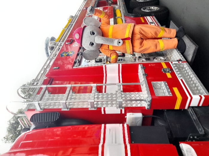 An elephant mascot, clad in an orange firefighter-style uniform with yellow reflective stripes and a red hat, stands on a deployed diamond plate platform on the right side of a red fire truck