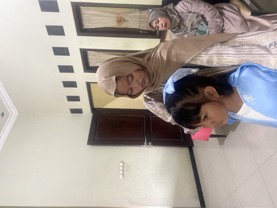 Three females are visible indoors. One is a child in a light blue garment. A second, wearing a brown head covering, appears to be sleeping. An older female in a gray headscarf and dress is reclined, seemingly watching over the other two. A light-colored wall with square decorative accents and windows provides a backdrop. A dark wooden door is also visible. The flooring appears to be tiled.