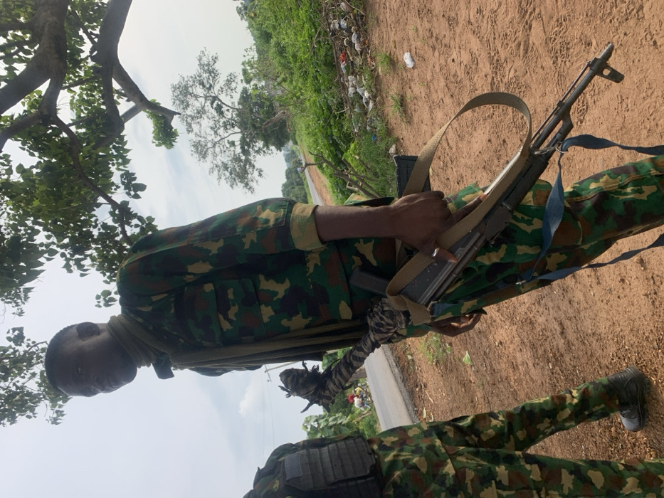 An outdoor scene in Zaki Biyem, Nigeria, depicts two individuals in military camouflage uniforms positioned by a paved road with a reddish-brown dirt shoulder