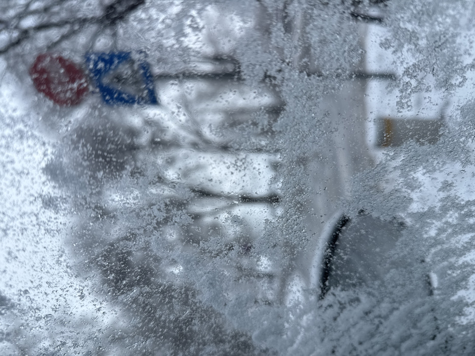 An obscured view through a frost-covered window. Shapes of blurry traffic signs and distant buildings are visible in the background. The frost creates a textured, granular pattern across the glass. The image is dominated by cool tones.