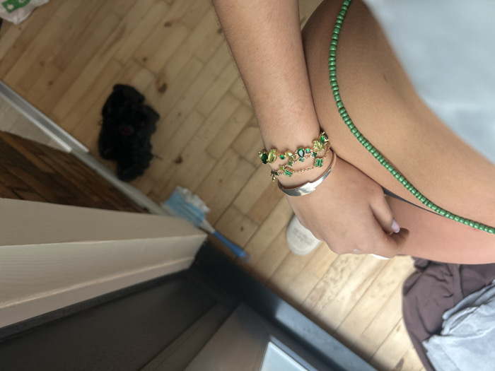 An angled, close-up perspective reveals a person’s arm and leg resting on a wooden floor. The arm is adorned with a gold bracelet featuring green stones and a silver cuff. A strand of small green beads drapes across the leg. Beside the arm and leg on the floor are a pair of shoes and a cleaning tool. A partial view of a piece of furniture is visible in the foreground of the shot.